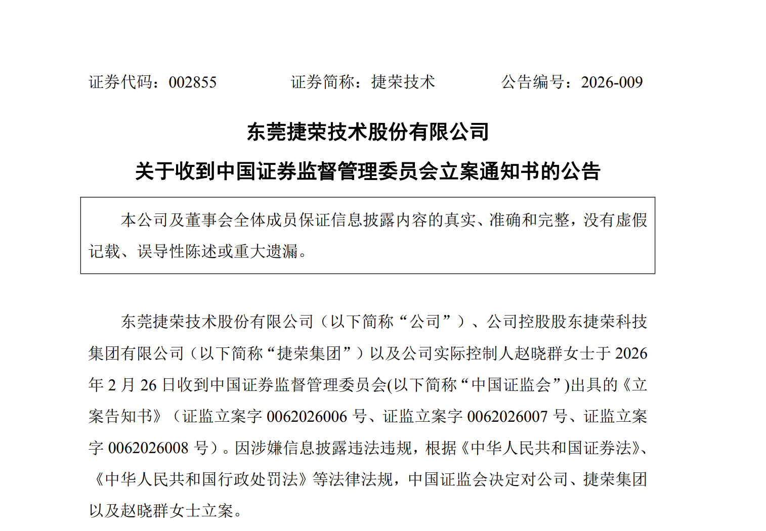 2月27日,东莞捷荣技术股份有限公司(以下简称“捷荣技术”)发布公告称,该公司及公司控股股东捷荣科技集团有限公司(以下简称“捷荣集团”)以及公司实际控制人赵晓群2 月 26 日收到中国证券监督管理委员会出具的《立案告知书》,因涉嫌信息披露违法违规被立案。