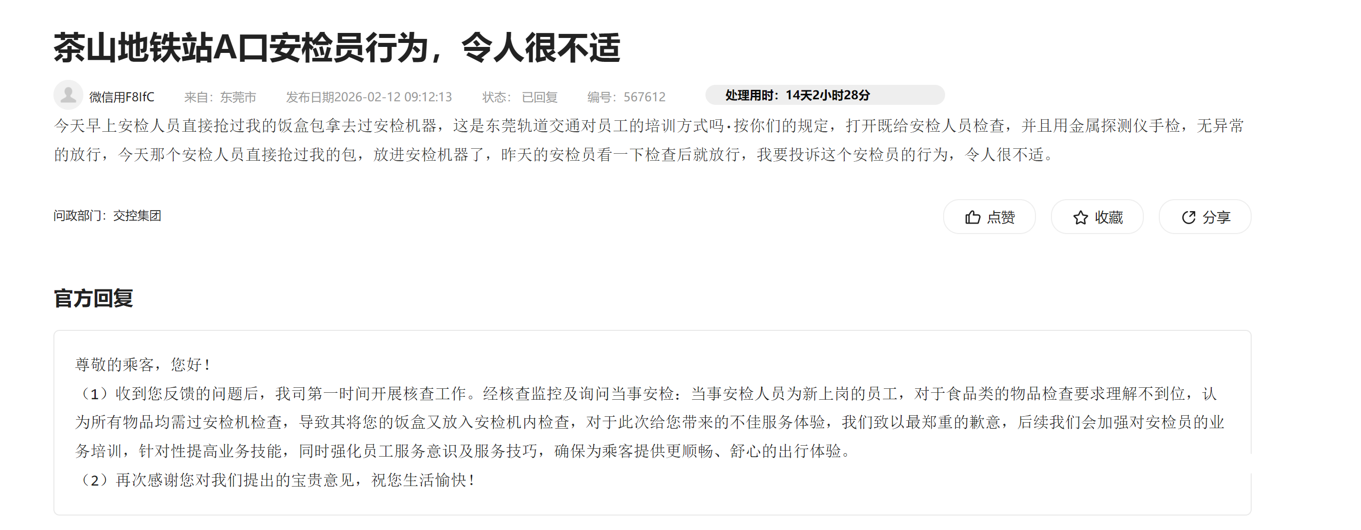 日前,有市民在东莞阳光热线问政平台上反映称,东莞地铁2号线茶山站A口安检员在检查饭盒时出现“行为令人不适”问题,影响其过安检及上班效率。2月26日,东莞交控集团作出官方回应并向乘客致歉,表示后续会加强对安检员的业务培训,同时强化员工服务意识及服务技巧。
